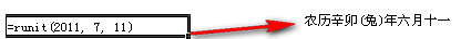 比如在单元格中写入公式=Lunar(2011,7,11),预览模板,可以看到日期2011年7月11日阳历就可以转换成阴历。