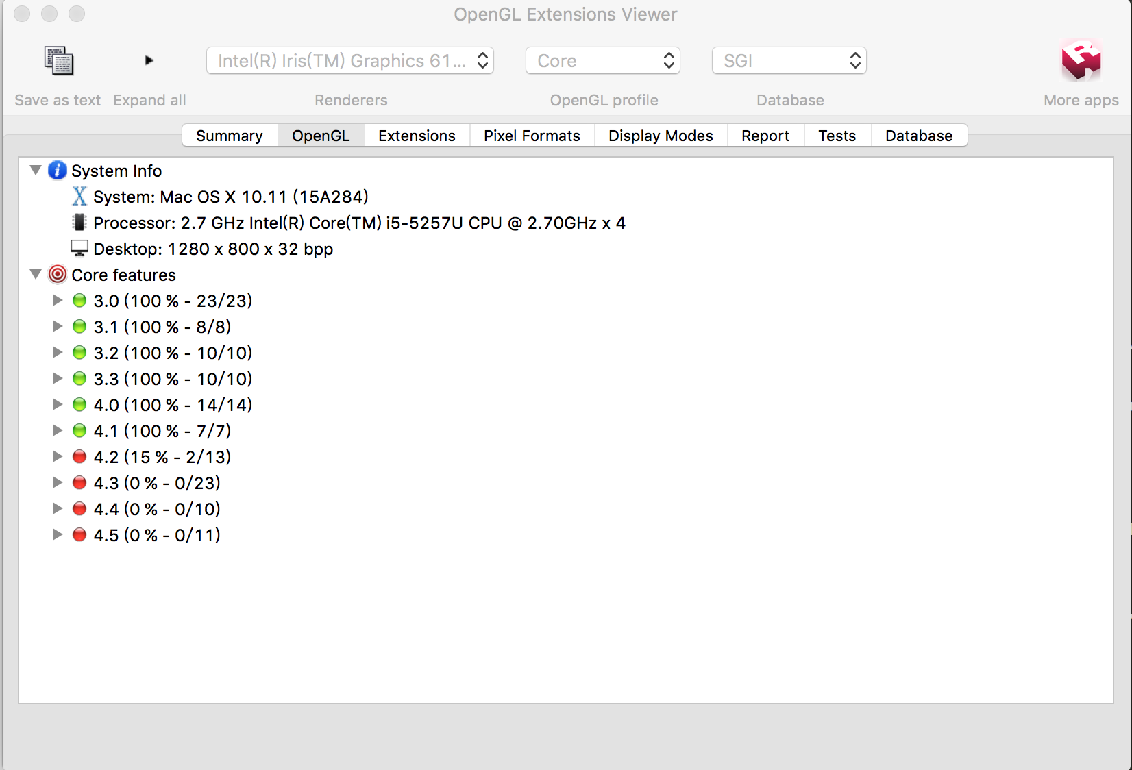 首先, 使用OpenGL Extensions Viewer可以看到系统显卡支持OpenGL 4.1版本的core功能。
