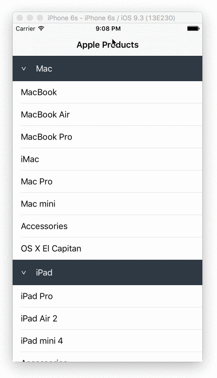 struct Section { var name: String! var items: [String]! var collapsed: Bool! init(name: String, items: [String]) { self.name = name self.items = items self.collapsed = false } } var sections = [Section]() sections = [ Section(name: "Mac", items: ["MacBook", "MacBook Air", "MacBook Pro", "iMac", "Mac Pro", "Mac mini", "Accessories", "OS X El Capitan"]), Section(name: "iPad", items: ["iPad Pro", "iPad Air 2", "iPad mini 4", "Accessories"]), Section(name: "iPhone", items: ["iPhone 6s", "iPhone 6", "iPhone SE", "Accessories"]) ]