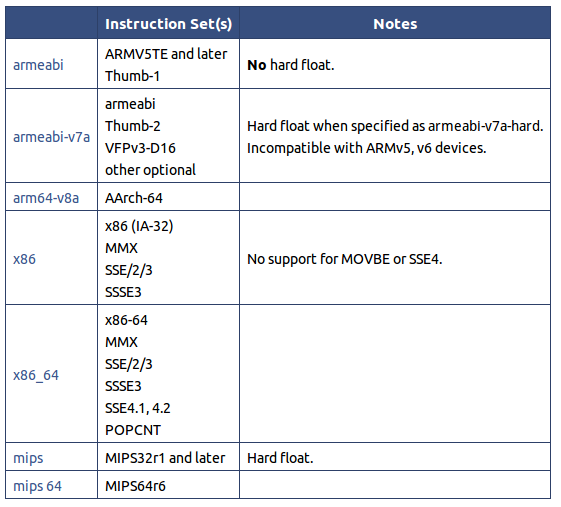 这里给出最新 Android NDK 所支持的ABI类型及区别: