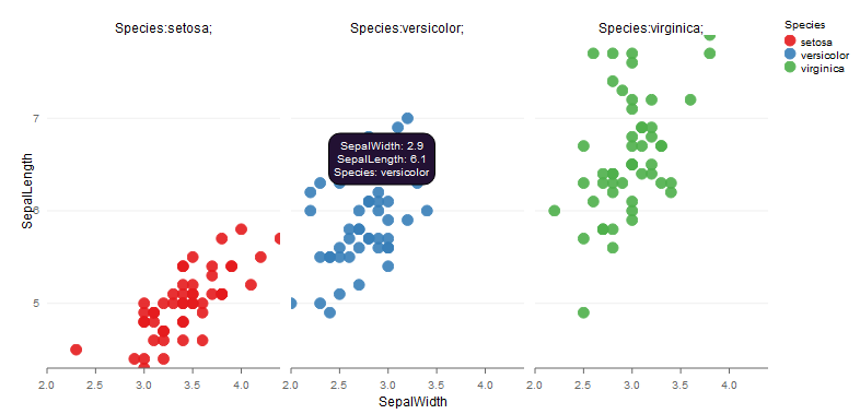 library(rCharts) names(iris) = gsub("//.", "", names(iris)) p1 <- rPlot(SepalLength ~ SepalWidth | Species, data = iris, color = 'Species', type = 'point') p1