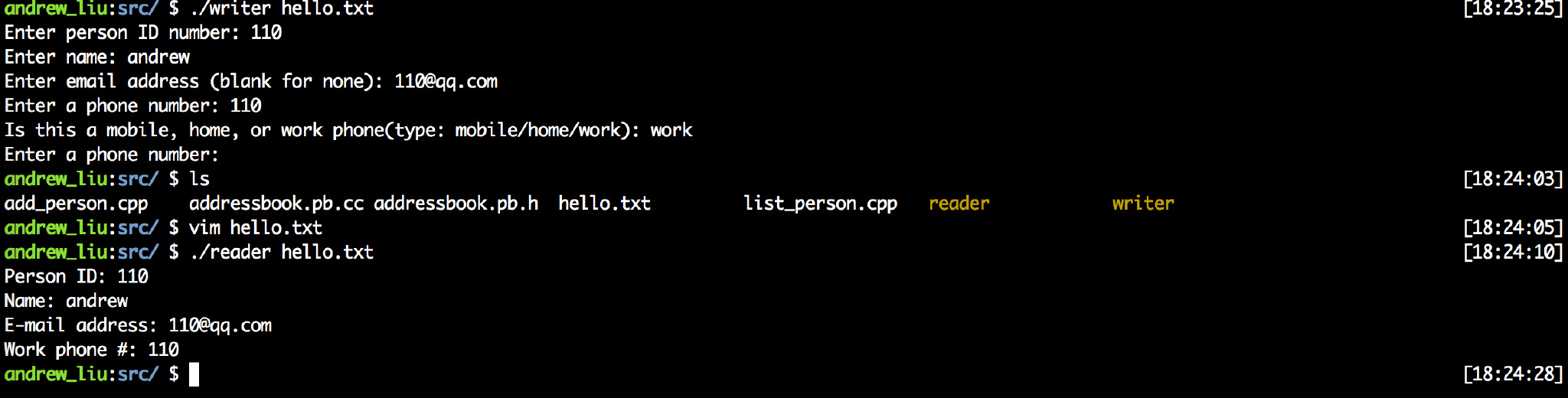 #编译add_person.cpp,生成writer可执行文件 $g++-owriteradd_person.cppaddressbook.pb.cc`pkg-config--cflags--libsprotobuf` #编译list_person.cpp,生成reader可执行文件 g++-oreaderlist_person.cppaddressbook.pb.cc`pkg-config--cflags--libsprotobuf`