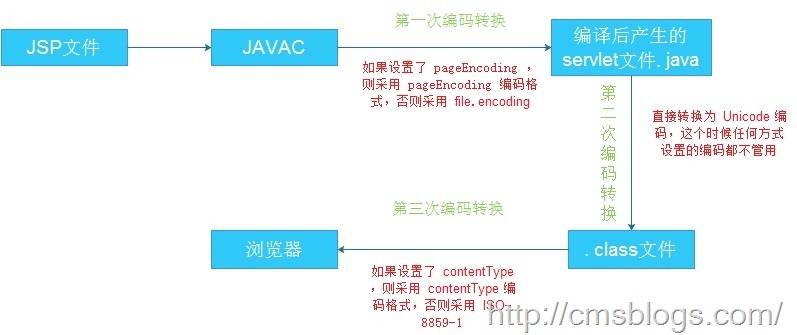 在前面一篇博客中就提到过(java中文乱码解决之道(四)—-java编码转换过程)jsp在转换为Servlet的过程中是需要经过主要的三次编码转换过程(除去数据库编码转换、页面参数输入编码转换):