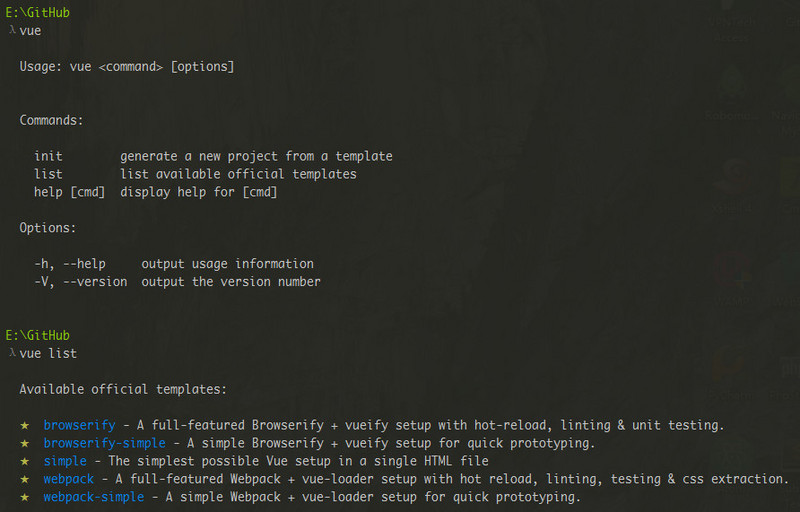 $> vue init webpack-simple github-file-explorer $> cd github-file-explorer $> npm install $> npm run dev 打开浏览器,输入 http://localhost:8080
