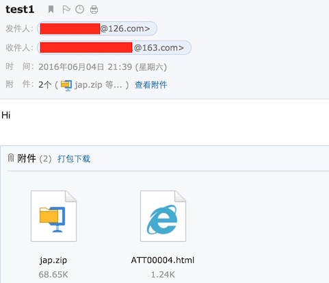 Hi <附件:jap.zip> This is my attachment! 附件后面的正文被截掉了,并自动形成了 ATT00004.html (其中包含了后半部分正文)!