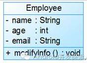 在UML类图中,类使用包含类名、属性(field)和方法(method)且带有分隔线的矩形来表示,比如下图表示一个Employee类,它包含name、age和email这3个属性,以及modifyInfo()方法。