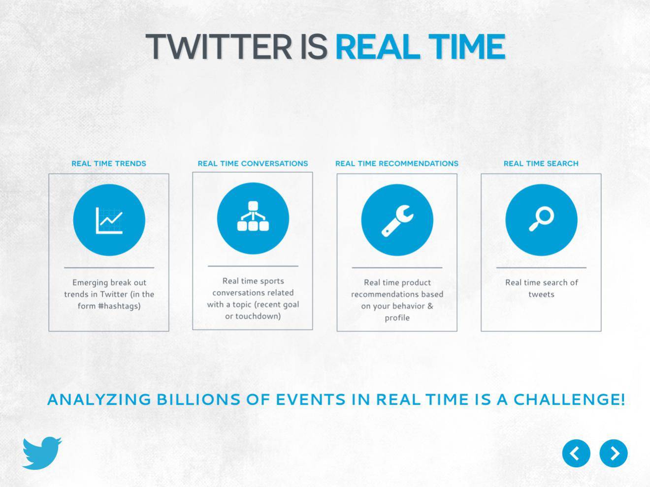生活中,有很多事务需要实时分析处理。让我们以Twitter为例。Twitter的产品的基石就是 实时性 。