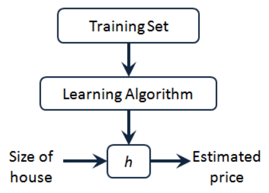 所以对于房价预测问题,我们是在训练集上执行学习算法,学习到一个假设 h ,然后将要预测的房屋的尺寸作为输入变量输入给 h ,而输出结果就是该房屋的交易价格。