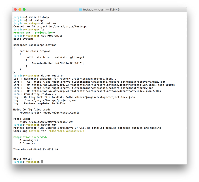 这给了你一个dotnet的命令行工具可以让你不用任何IDE来创建,构建,运行项目。接下来是告诉你如何创建并运行一个新的“Hello World”控制台应用程序: