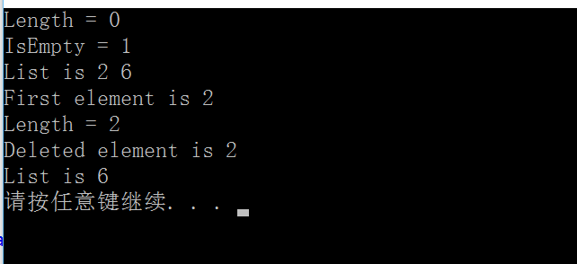 #include<iostream> #include"llist.h" #include"xcept.h" int main(){ using std::cout; using std::endl; using std::cin; try{ LinearList<int> L(5); cout << "Length = " << L.Length() << endl; cout << "IsEmpty = " << L.isEmpty() << endl; L.Insert(0, 2).Insert(1, 6); cout << "List is " << L << endl; int z; L.Find(1, z); cout << "First element is " << z << endl; cout << "Length = " << L.Length() << endl; L.Delete(1, z); cout << "Deleted element is " << z << endl; cout << "List is " << L << endl; } catch (...){ std::cerr << "An exception has occured" << endl; } system("pause"); return 0; }