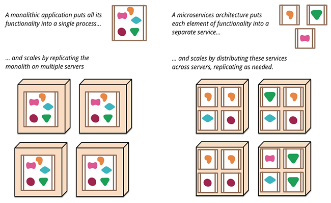 这些挫折导致了微服务的架构方式:以服务套件的形式构建软件。微服务是独立部署的和可扩展的,每个服务都有明确的模块边界,甚至允许不同的服务使用不同的编程语言,它们甚至可以由不同的团队管理。