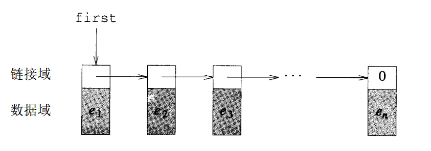 令$L=(e_1,e_2,/ldots,e_n)$是一个线性表,其链表描述如下图所示,每个节点都包含一个链接域,用以指向表中的下一个元素。所以节点$e i$的指针将指向$e {i+1}$,其中$1/le i /lt n$。节点$e_n$没有下一个节点,所以它的链接域是NULL(或0)。指针变量 first 指向描述中的第一个节点。