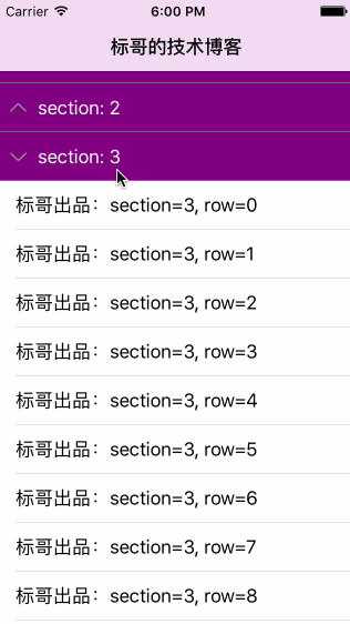 #pragma mark - UITableViewDataSource - (NSInteger)numberOfSectionsInTableView:(UITableView *)tableView { return self.sectionDataSources.count; } - (NSInteger)tableView:(UITableView *)tableViewnumberOfRowsInSection:(NSInteger)section { HYBSectionModel *sectionModel = self.sectionDataSources[section]; return sectionModel.isExpanded ? sectionModel.cellModels.count: 0; } - (UITableViewCell *)tableView:(UITableView *)tableViewcellForRowAtIndexPath:(NSIndexPath *)indexPath { UITableViewCell *cell = [tableViewdequeueReusableCellWithIdentifier:kCellIdentfier forIndexPath:indexPath]; HYBSectionModel *sectionModel = self.sectionDataSources[indexPath.section]; HYBCellModel *cellModel = sectionModel.cellModels[indexPath.row]; cell.textLabel.text = cellModel.title; return cell; } - (UIView *)tableView:(UITableView *)tableViewviewForHeaderInSection:(NSInteger)section { HYBHeaderView *view = [tableViewdequeueReusableHeaderFooterViewWithIdentifier:kHeaderIdentifier]; HYBSectionModel *sectionModel = self.sectionDataSources[section]; view.model = sectionModel; view.expandCallback = ^(BOOL isExpanded) { [tableViewreloadSections:[NSIndexSetindexSetWithIndex:section] withRowAnimation:UITableViewRowAnimationFade]; }; return view; } #pragma mark - UITableViewDelegate - (CGFloat)tableView:(UITableView *)tableViewheightForRowAtIndexPath:(NSIndexPath *)indexPath { return 44; } - (CGFloat)tableView:(UITableView *)tableViewheightForHeaderInSection:(NSInteger)section { return 44; } Tip:在tableview的优化中,其中有一条就是复用cell、复用header/footer view。