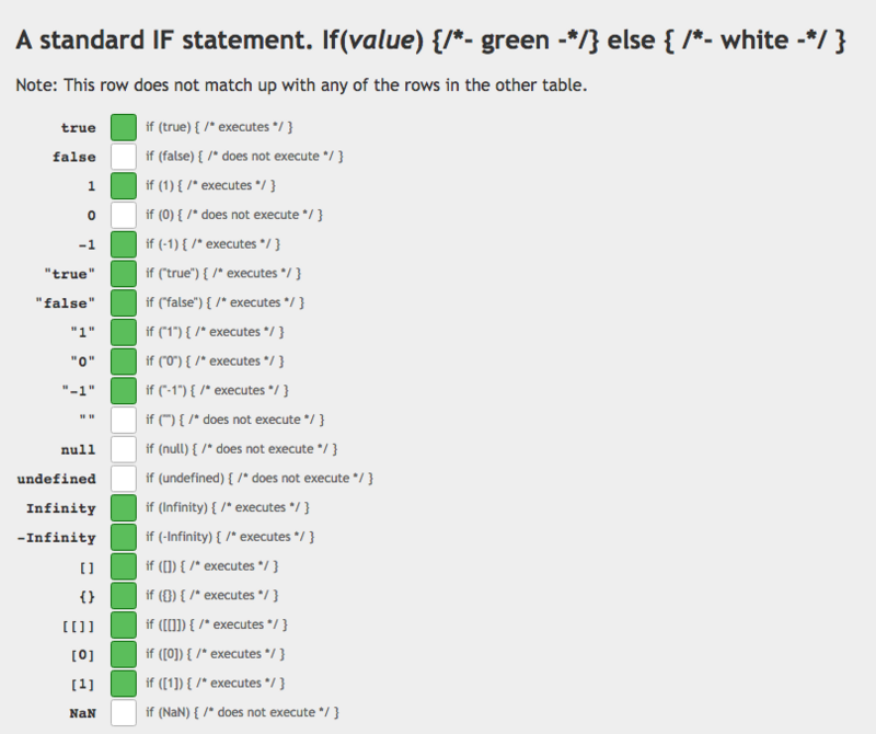 var a = [0]; if ([0]) { console.log(a == true); } else { console.log("wut"); } JavaScript-Equality-Table
