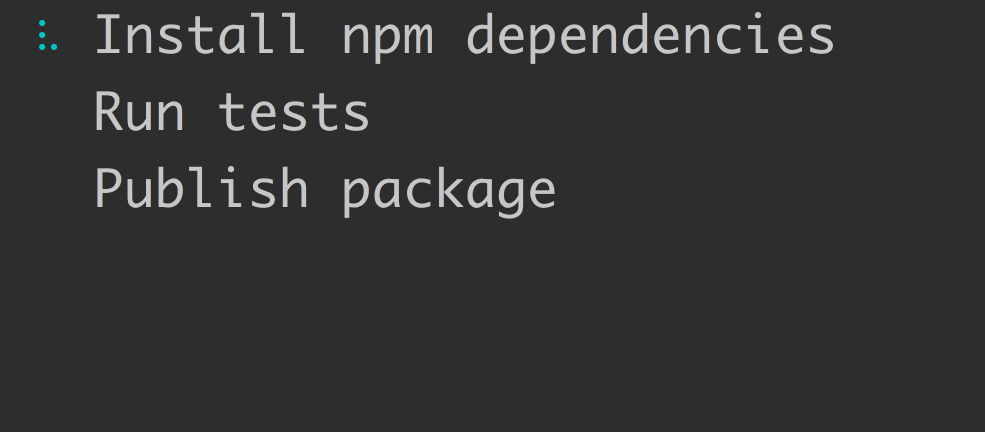 $ npm install --save listr const execa = require('execa'); const Listr = require('listr'); const tasks = new Listr([ { message: 'Install package dependencies', task: () => execa('npm', ['install']) }, { message: 'Run tests', task: () => execa('npm', ['test']) }, { message: 'Publish package', task: () => execa('npm', ['publish']) } ]); tasks.run().catch(err => { console.error(err); });