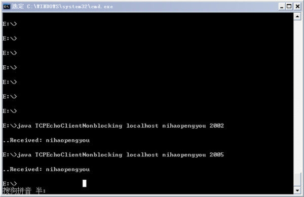 import java.nio.channels.SelectionKey; import java.nio.channels.SocketChannel; import java.nio.channels.ServerSocketChannel; import java.nio.ByteBuffer; import java.io.IOException; public class EchoSelectorProtocol implements TCPProtocol { private int bufSize; // 缓冲区的长度 public EchoSelectorProtocol(int bufSize){ this.bufSize = bufSize; } //服务端信道已经准备好了接收新的客户端连接 public void handleAccept(SelectionKey key) throws IOException { SocketChannel clntChan = ((ServerSocketChannel) key.channel()).accept(); clntChan.configureBlocking(false); //将选择器注册到连接到的客户端信道,并指定该信道key值的属性为OP_READ,同时为该信道指定关联的附件 clntChan.register(key.selector(), SelectionKey.OP_READ, ByteBuffer.allocate(bufSize)); } //客户端信道已经准备好了从信道中读取数据到缓冲区 public void handleRead(SelectionKey key) throws IOException{ SocketChannel clntChan = (SocketChannel) key.channel(); //获取该信道所关联的附件,这里为缓冲区 ByteBuffer buf = (ByteBuffer) key.attachment(); long bytesRead = clntChan.read(buf); //如果read()方法返回-1,说明客户端关闭了连接,那么客户端已经接收到了与自己发送字节数相等的数据,可以安全地关闭 if (bytesRead == -1){ clntChan.close(); }else if(bytesRead > 0){ //如果缓冲区总读入了数据,则将该信道感兴趣的操作设置为为可读可写 key.interestOps(SelectionKey.OP_READ | SelectionKey.OP_WRITE); } } //客户端信道已经准备好了将数据从缓冲区写入信道 public void handleWrite(SelectionKey key) throws IOException { //获取与该信道关联的缓冲区,里面有之前读取到的数据 ByteBuffer buf = (ByteBuffer) key.attachment(); //重置缓冲区,准备将数据写入信道 buf.flip(); SocketChannel clntChan = (SocketChannel) key.channel(); //将数据写入到信道中 clntChan.write(buf); if (!buf.hasRemaining()){ //如果缓冲区中的数据已经全部写入了信道,则将该信道感兴趣的操作设置为可读 key.interestOps(SelectionKey.OP_READ); } //为读入更多的数据腾出空间 buf.compact(); } } 执行结果如下: