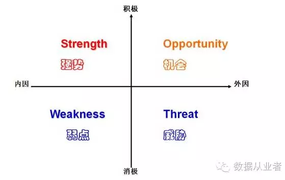 SWOT:优势(Strength)、劣势(Weakness)、机会(Opportunity)、威胁(Threat)。其中,优势与劣势是对自身条件的分析,机会与威胁是对外部环境的分析。