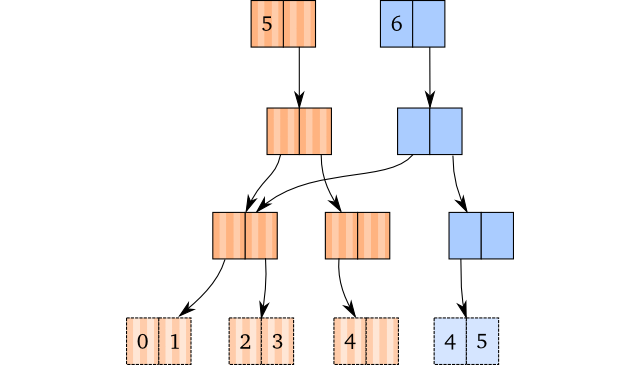 正如 Part 1 所解释的那样,我们做了路径拷贝并替换叶子节点上的元素。但是呢,注意到它们共享了尾部:毕竟,它没有变动,因此为什么要费心去拷贝它呢?