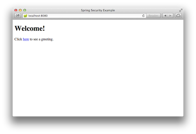 <!DOCTYPE html> <html xmlns="http://www.w3.org/1999/xhtml" xmlns:th="http://www.thymeleaf.org" xmlns:sec="http://www.thymeleaf.org/thymeleaf-extras-springsecurity3"> <head> <title>Spring Security Example</title> </head> <body> <h1>Welcome!</h1> <p>Click <a th:href="@{/hello}">here</a> to see a greeting.</p> </body> </html> 如你所见,这个简单的视图包括一个指向“/hello”页面的链接,它由下面这个themeleaf模板来定义: