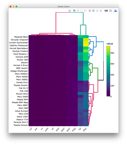 heatmaply(mtcars, k_col = 2, k_row = 3) %>% layout(margin = list(l = 130, b = 40))