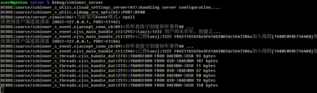 DigitalOcean的服务器装的是Ubuntu 16.04,居然自己的程序编译不过,明明安装了json-c和Libevent的开发库。所以目前还是在本地测试的,如果有好心人在外网部署出错后,请赶紧AT我调试修正哦。不同程序的端口工作的效果大同小异,这里贴出工作的效果图吧!