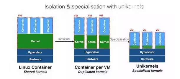 Unikernel使用户可以从一个服务库中选择应用需要的操作系统服务而无须整个操作系统,用户选择的服务则会成为应用的一部分。
