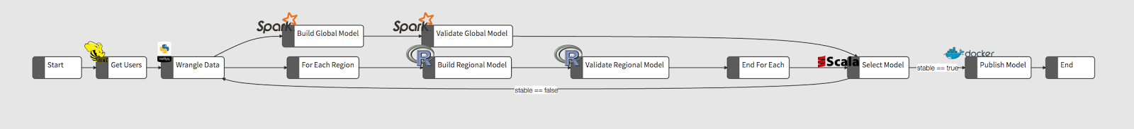 val getUsers = Step("Get Users", ...) val wrangleData = Step("Wrangle Data", ...) ... val regionSplit = Step("For Each Region", ...) val regionJoin = Step("End For Each", ...) val regions = Seq("US", "Canada", "UK_Ireland", "LatAm", ...) val wf = start -> getUsers -> wrangleData ==> ( trainGlobalModel -> validateGlobalModel, regionSplit **(reg = regions) --< (trainRegModel, validateRegModel) >-- regionJoin ) >== selectModel -> validateModel -> end // If verbs are preferred over operators val wf = sequence(start, getUsers, wrangleData) parallel { sequence(trainGlobalModel, validateGlobalModel) sequence(regionSplit, forEach(reg = regions) sequence(trainRegModel, validateRegModel) forEach, regionJoin) } parallel sequence(selectModel, validateModel, end) 从一开始,Meson就为了可扩展性而构建,这样它很容易地添加自定义步骤和扩展。Spark Submit步骤,Hive查询步骤,Netflix特定扩展让我们可以接触微服务或其他系统,比如Cassandra。