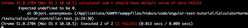 angular.module('calculatorApp', []).controller('CalculatorController', function CalculatorController($scope) { $scope.sum = function() { $scope.z = $scope.x + $scope.y; }; }); 在命令行工具里面我们可以看到karma检测到了文件变化,重新进行测试,这个时候测试就会通过了。