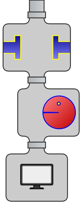 图 1 显示了以下流管道的 “流机器” 的动画(或者在某些浏览器中显示为快照)。(在图 1 中,黄色、绿色和蓝色块按顺序进入机器顶部的第一个阶段。在第一个阶段,每个块压缩为更小的块,然后进入第二个阶段。在这里,一个类似吃豆人的游戏人物吃掉每个黄色块,仅让绿色和蓝色块落入第三个阶段。压缩的蓝色和绿色块交替显示在计算机屏幕上。)