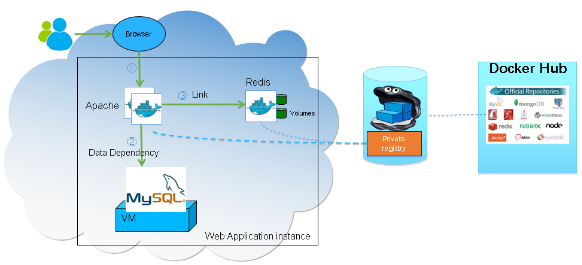 下面以一个典型的 Web 应用程序为例,来说明 Docker 如何用来发布和运行应用程序。通常 Web 程序包含一个或多个 Apache 程序用来对外提供服务,一个存储模块为 Apache 提供服务,一个数据库服务,之前这些服务都是安装在物理机上,需要在物理机上配置好权限和运行时环境,而且确保不同的程序之间的依赖不存在冲突(比如:不同的程序有可能需要不同 Python 版本)。如果使用 Docker,我们只需要在物理机上安装 Docker,将 Apache 和 Redis 应用放在单独的 Docker 镜像中。Docker 镜像可以用私有 Docker Registry 来存储和分发,Private Docker Registry 可以从 Docker Hub 同步一些镜像,这样 Docker host 在下载 Docker 镜像的时候可以直接从 Private Docker Registry 下载,速度会比较快。数据库这种基础数据服务可以不用放在 Docker 容器里面运行。这样搭建起来的应用程序结构清晰,升级以及管理维护会很简单(只需要更新 Docker Registry 中的 Docker 镜像即可)。