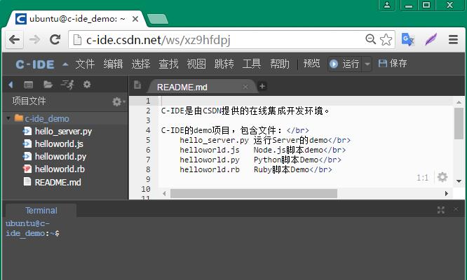 C-IDE 是由CSDN提供的云端在线集成开发环境,允许用户在云端创建开发环境,打开浏览器即可随时随地敲代码。C-IDE前端基于浏览器的编辑器,功能强大,后端基于Docker的Ubuntu操作系统,您可以使用linux系统下的各种语言开发环境,如gdb、gcc 、Java、ruby、Python等,也可以根据自己的需求安装各种软件包(apt-get)。