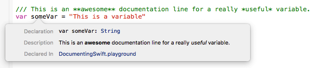 让我们来看一个简单的例子熟悉一下 Markdown 语法吧。在下面的代码块中,我们为一个属性添加了一行可以产生代码文档的注释。我建议你可以打开 Xcode 中 Playground 来试试本文中提到的所有例子。(校对注:为了保持和截图一致,下面的注释没有翻译)
