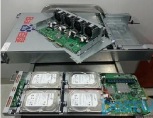 atlas基于如图所示arm存储机, 2U放6个机器, 每个机器4核、4GB内存、4个3T硬盘, 2U总共72TB存储, 相比普通机架服务器,存储密度提升1倍。arm存储机的内存量过小, 而文件系统产生的元数据过大, 考虑性能原因不能把文件存储成文件。 甚至也不能采用haystack存储方式, haystack元数据虽然小, 但也超过ARM存储机的内存量。