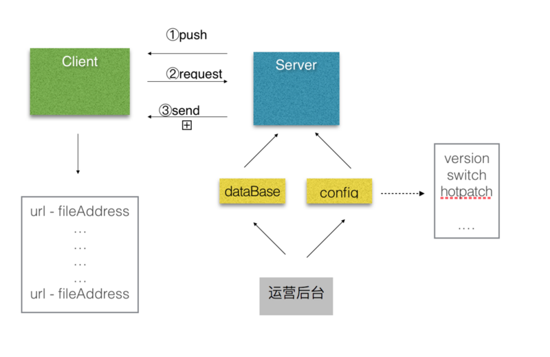 3. server 根据 config 里的选项,比对从 client 拿到的 config ,发现客户端是旧版本的 config ,OK,则下发新的 config 给 client ,并且发送从 database 里拿到的资源包(为了加快速度,可以部署到 CDN )。