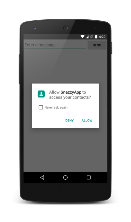 if (ContextCompat.checkSelfPermission(thisActivity, Manifest.permission.READ_CONTACTS) != PackageManager.PERMISSION_GRANTED) { // 是否要显示问什么要获取权限的解释界面 if (ActivityCompat.shouldShowRequestPermissionRationale(thisActivity,Manifest.permission.READ_CONTACTS)) { // 显示解释权限用途的界面,然后再继续请求权限 } else { // 没有权限,直接请求权限 ActivityCompat.requestPermissions(thisActivity, new String[]{Manifest.permission.READ_CONTACTS}, MY_PERMISSIONS_REQUEST_READ_CONTACTS); } } 代码执行时会弹出系统默认的请求权限对话框