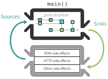 Cycle.js 把应用程序抽象成一个纯函数 main() ,从外部世界读取副作用( sources ),然后产生输出( sinks ) 传递到外部世界,在那形成副作用。这些外部世界的副作用,做为Cycle.js的插件存在(drivers),它们负责:处理DOM、提供HTTP访问等。