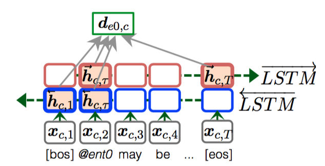 模型还是采用双向LSTM来构建,这时动态entity表示由四部分构成,包括两个方向上的hidden state,以及表示该entity所在句子的last hidden state,也就是该entity所在的上下文表示。如下图所示: