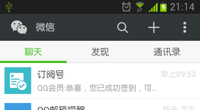相信大家都会认定微信是在手机上最火的应用程序了,几乎每个人的手机上都有安装它。微信除了功能非常强大之外,界面也是做得相当美观,它的ActionBar让人看着有一种赏心悦目的感觉,如下图所示: