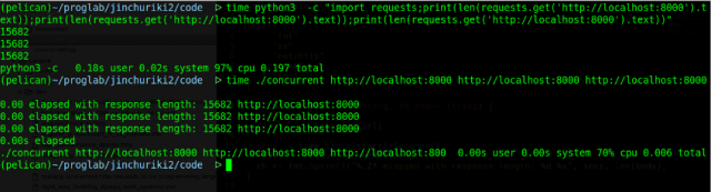 $ timepython3 -c "import requests;print(len(requests.get('http://localhost:8000').text));print(len(requests.get('http://localhost:8000').text));print(len(requests.get('http://localhost:8000').text))" $ time ./concurrenthttp://localhost:8000 http://localhost:8000 http://localhost:8000