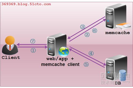 2、如果请求的数据不在memcached中,就去查数据库,把从数据库中获取的数据返回给客户端,同时把数据缓存一份到memcached中(memcached客户端不负责,需要程序明确实现),路径操作为①②④⑤⑦⑥。