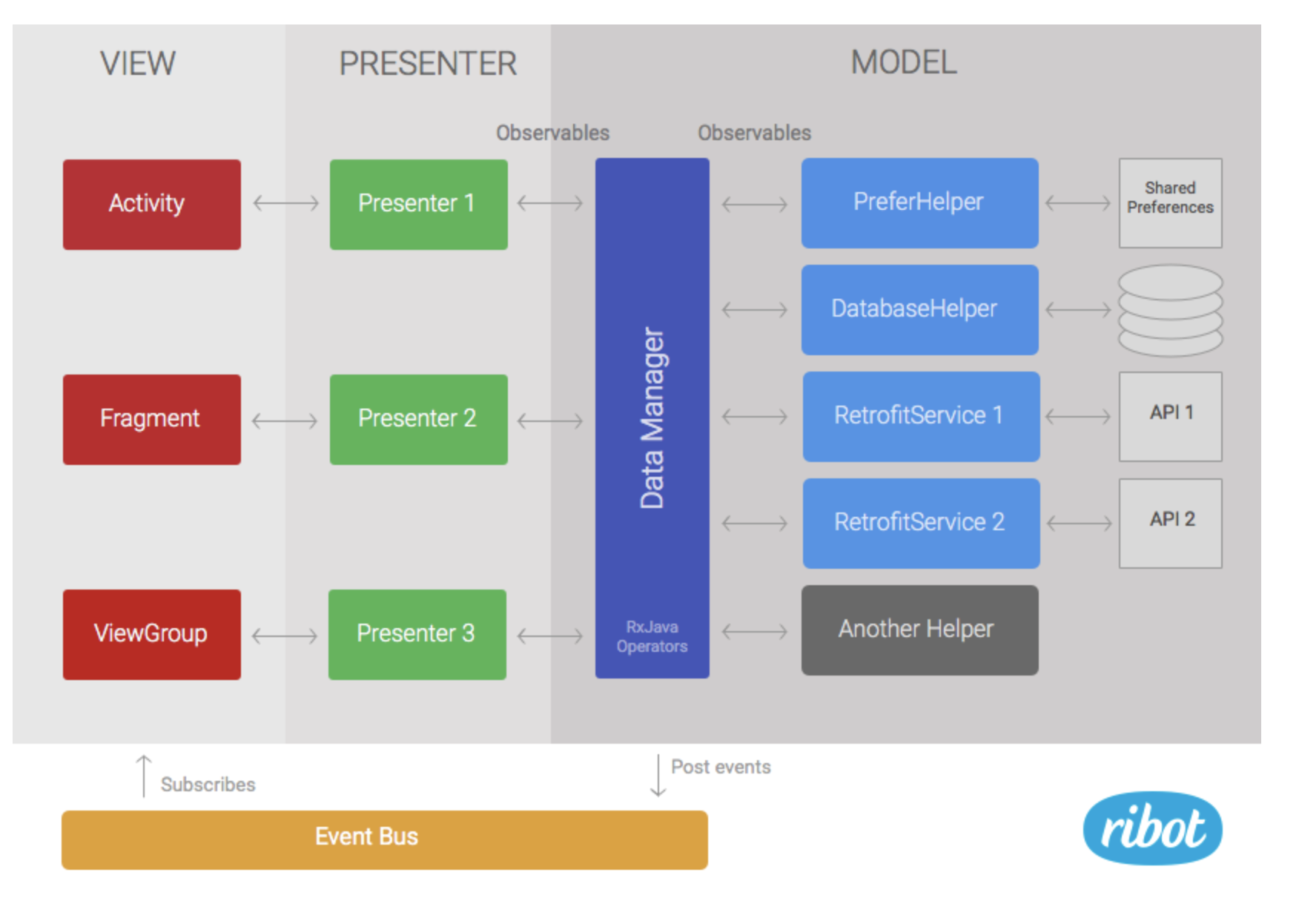与常规的 MVP 不同的是,在 modle 层和 view 层通过EventBus 连接,当数据发生变化时,发出对应的 event,注册了这个 event 的 view会采取对应的措施。举个例子,退出登录用在这样的情形就很合适,在退出登录后,我们可能不止一个 view 会发生变化,如果把这些写在每一个 Presenter 中无疑是很不简洁的代码