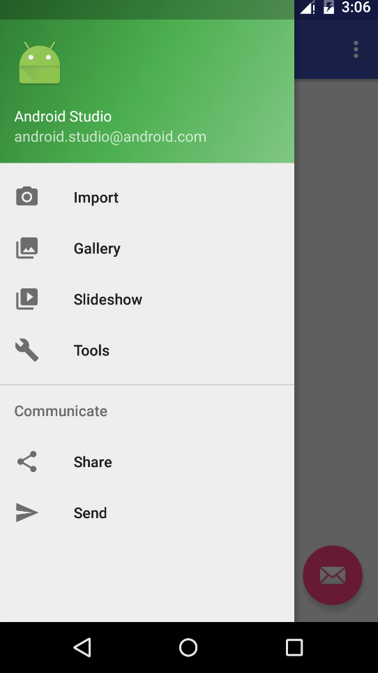 Material Design系列控件,我们今天就先从侧滑菜单栏开始,侧滑菜单栏通过名字我们就知道包含两部分,一部分是侧滑(DrawerLayout),一部分是导航菜单栏(NavigationView)。DrawerLayout包含NavigationView,一设置侧滑菜单栏就形成了。因为建立一个侧滑菜单很简单,在用Android Studio新建项目时,最后选择Navigation Drawer Activity或者在新建Activity时选择Navigation Drawer Activity,就出来了。今天我们讲一下它们的自定义配置。