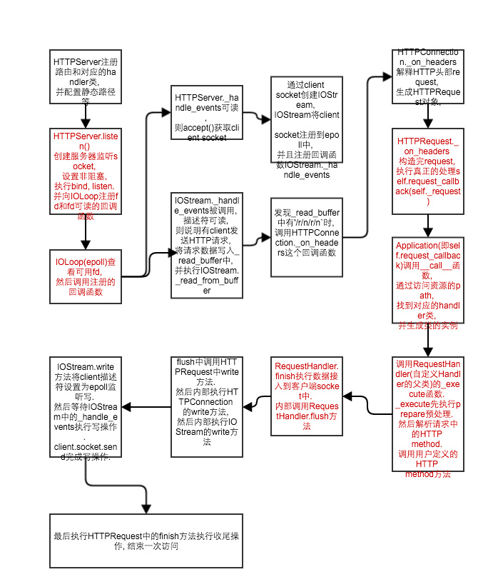 八. 完成数据写入client socket后, HTTPRequest.finish() 被调用执行移除时间和关闭客户端socket操作. 是不是已经晕了, 稍等我们来画个图来理一理整个流程.