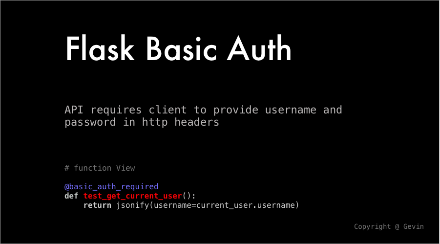 auth = request.authorization username = auth.username password = auth.password 因此,Flask中只要封装一个basic auth装饰器,然后把该装饰器应用到需要使用basic auth的API中即可:
