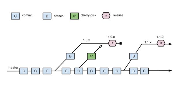 在进行版本发布和 hotfix 时也有类似的流程。当需要发布新版本时,采用的是如下的流程: