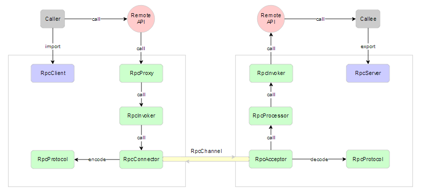RPC 服务方通过 RpcServer 去导出(export)远程接口方法 ,而 客户方通过 RpcClient 去引入(import)远程接口方法 。 客户方像调用本地方法一样去调用远程接口方法, RPC 框架提供接口的代理实现,实际的调用将委托给代理 RpcProxy 。 代理封装调用信息并将调用转交给 RpcInvoker 去实际执行 。 在客户端的 RpcInvoker 通过连接器 RpcConnector 去维持与服务端的通道 RpcChannel, 并使用 RpcProtocol 执行协议编码(encode)并将编码后的请求消息通过通道发送给服务方。
