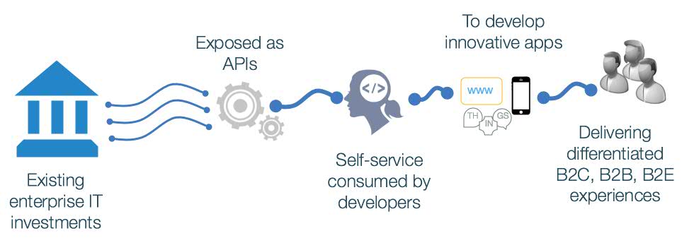 API 经济价值链始于将企业 IT 投资公开为 API,如下图所示。通过编目这些 API,您可以使用它们,例如,通过使用一个呈现 API 及其接口的自助服务门户。通过使用 API,您可以创建创新的应用程序,获得不同的体验。