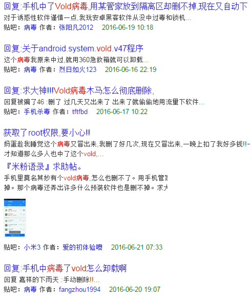 近 日,360安全中心收到多起用户反馈,手机中了一种难以清理的病毒,某些用户尝试自行清理掉病毒,发现删除病毒文件vold.apk后,会再次重现。通过分析,发现此病毒已经寄生到系统底层,定时恢复APK实现自我保护。随着反馈用户数量急剧上升,360急救箱已下发紧急查杀方案,全面支持清理该手机病毒。