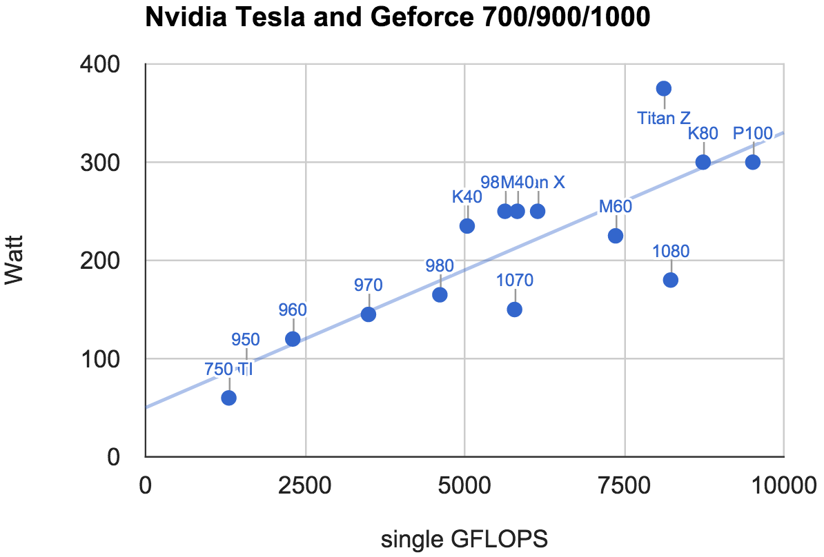 Nvidia最近更新了三块基于Pascal的GPU,分别是面向高端用户的P100和正常用户的GTX 1080和GTX 1070. 很多用GPU做计算的小伙伴问新卡值不值得买。很明显是,无论从功耗,价格(下面两图比较了N厂各卡),还是内存大小和带宽来看,肯定是新卡更好。而且这是三个之中个人推荐是GTX 1080。原因是P100太贵目前不是一般人能买的,虽然1070和1080在价格,功耗,计算上基本是正比关系。但在付相同额外开销(CPU,内存,机器空间,后期维护)下,1080能得到的计算密度更高。