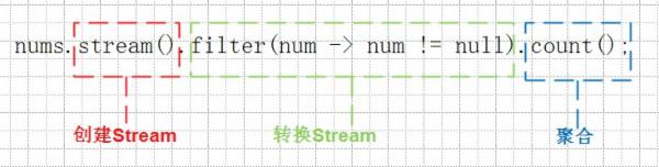 图片就是对于Stream例子的一个解析,可以很清楚的看见:原本一条语句被三种颜色的框分割成了三个部分。红色框中的语句是一个Stream的生命开始的地方,负责创建一个Stream实例;绿色框中的语句是赋予Stream灵魂的地方,把一个Stream转换成另外一个Stream,红框的语句生成的是一个包含所有nums变量的Stream,进过绿框的filter方法以后,重新生成了一个过滤掉原nums列表所有null以后的Stream;蓝色框中的语句是丰收的地方,把Stream的里面包含的内容按照某种算法来汇聚成一个值,例子中是获取Stream中包含的元素个数。如果这样解析以后,还不理解,那就只能动用“核武器”–图形化,一图抵千言!